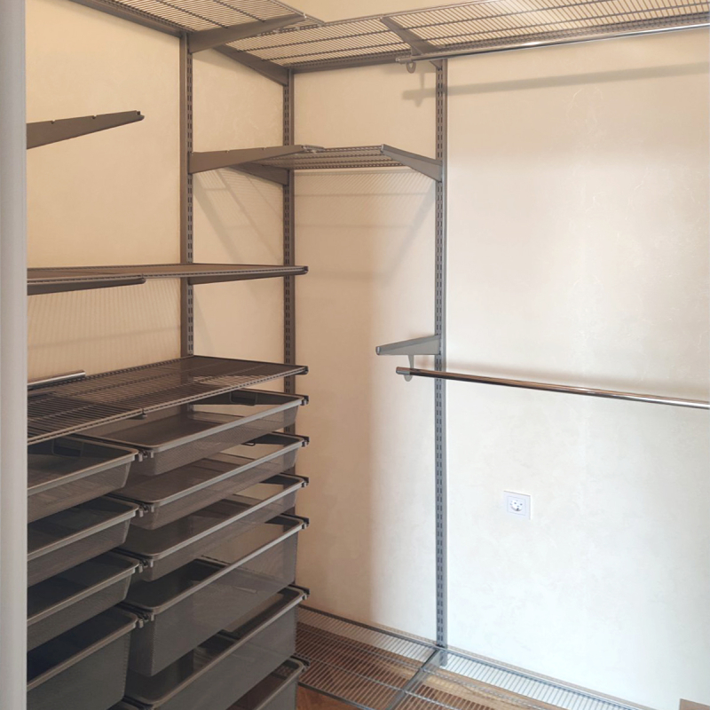 Угловая гардеробная Gardie — современная система хранения, разработанная для удобного и рационального использования пространства. Гардеробная выполнена из надежной системы Гардие и оснащена сетчатыми полками, выдвижными корзинами и штангами для одежды.