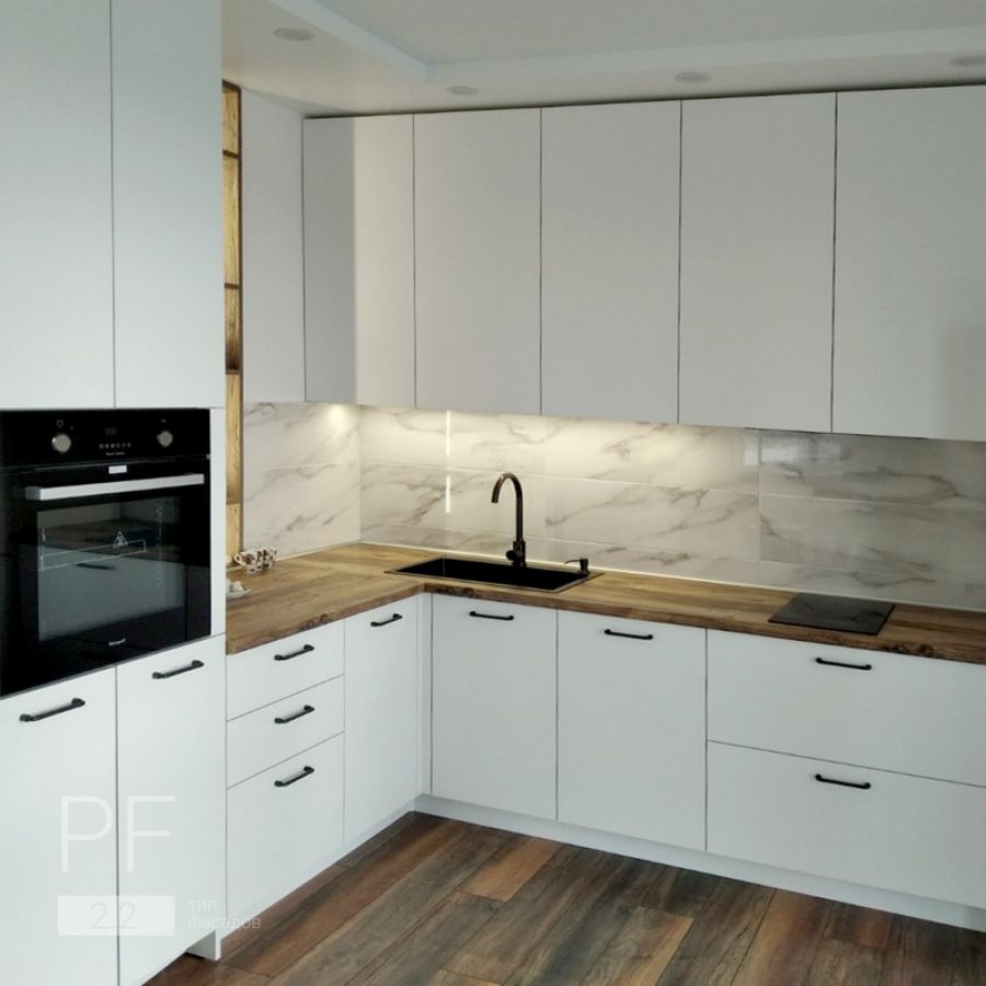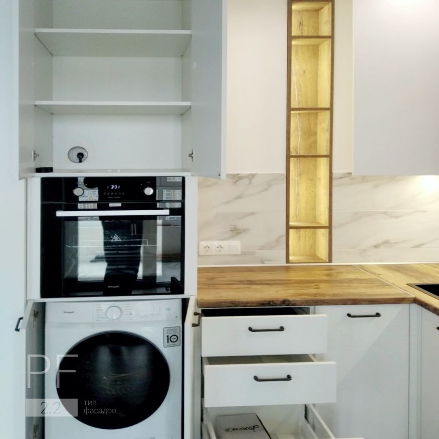 Красивая функциональная кухня, в которой грамотно задействован каждый см пространства - высокие верхние шкафы, зона хранения над вытяжкой, стиральная машина под духовым шкафом, акцентная полка в нише. Аккуратно, современно, практично, доступно.