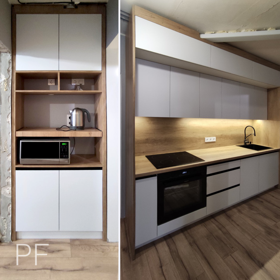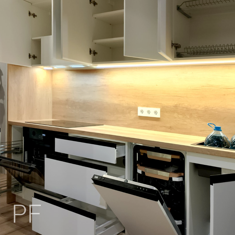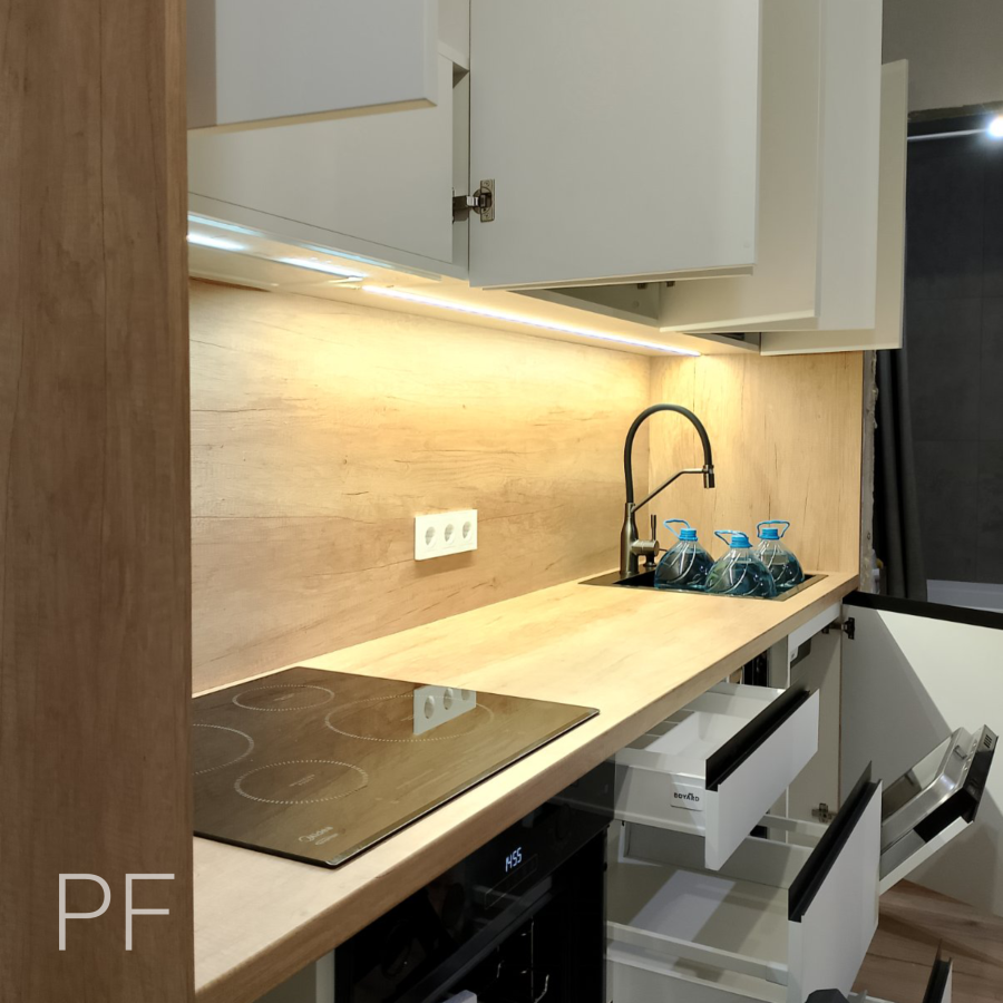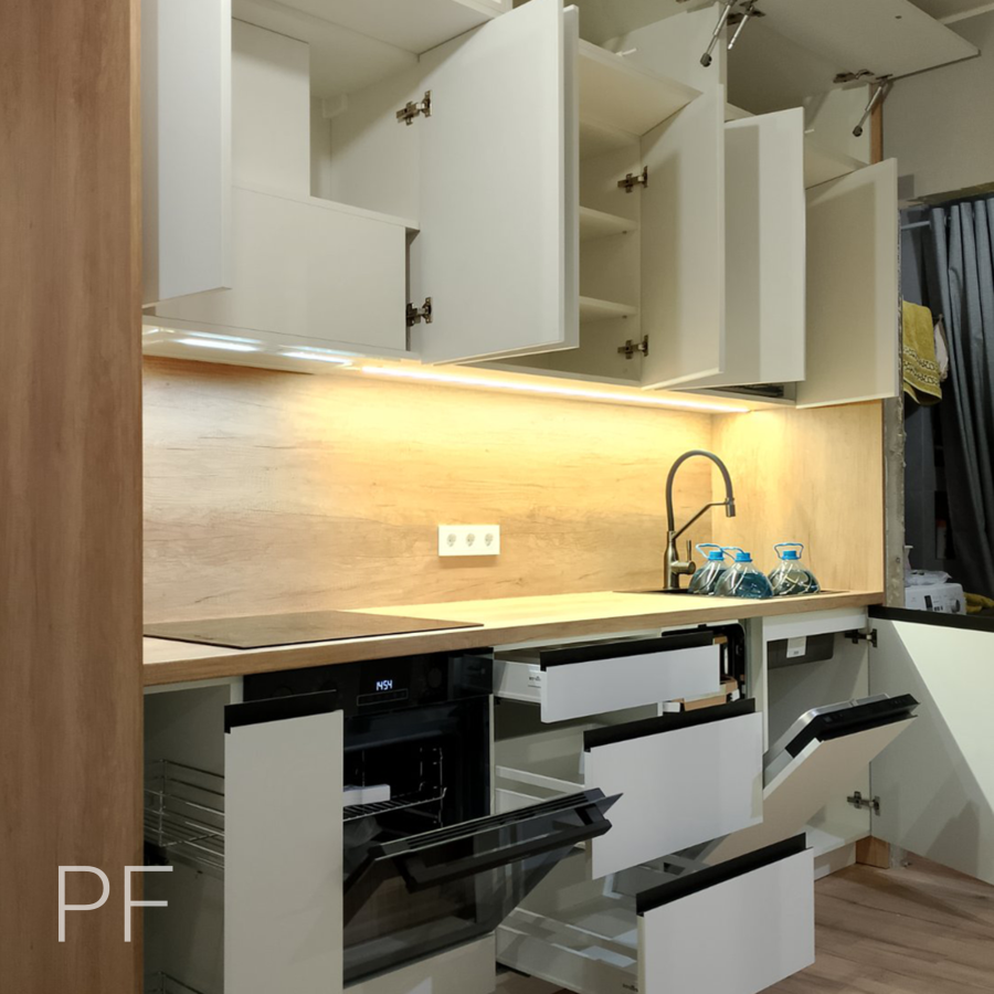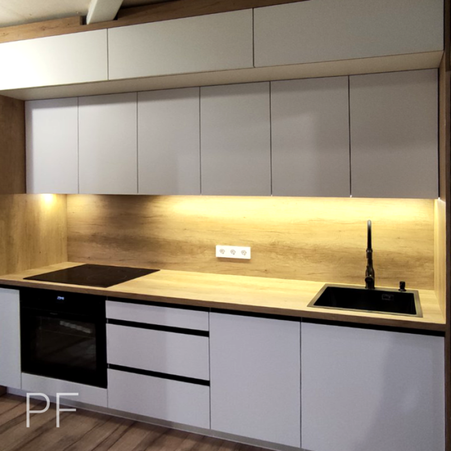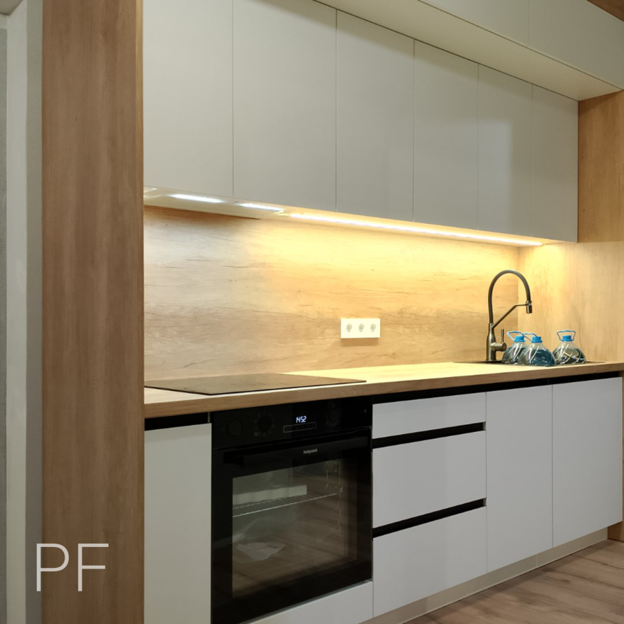 Прямая кухня, в которой грамотно использована вся высота помещения для организации хранения. Белые фасады идеально сочетаются со столешницей Дуб Небраско Светлый.