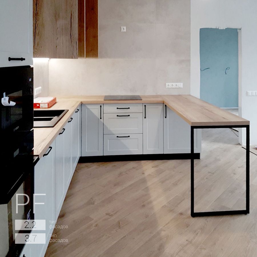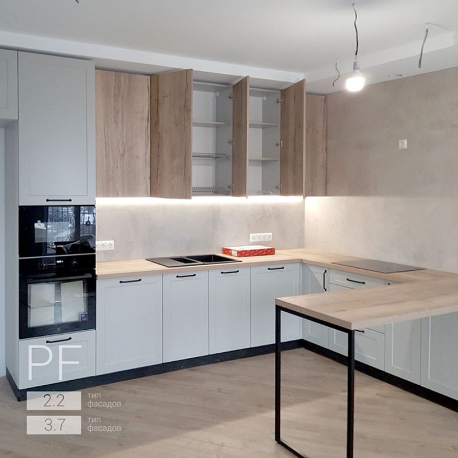 Чистота форм, приятное сочетание дерева и матового светло-серого, столешница, переходящая в стол с акцентной черной опорой, контрастный цоколь и утонченные аккуратные ручки – все сбалансировано в этой элегантном и строгом проекте. Функциональность и качество использования гарантирует фурнитура Blum.