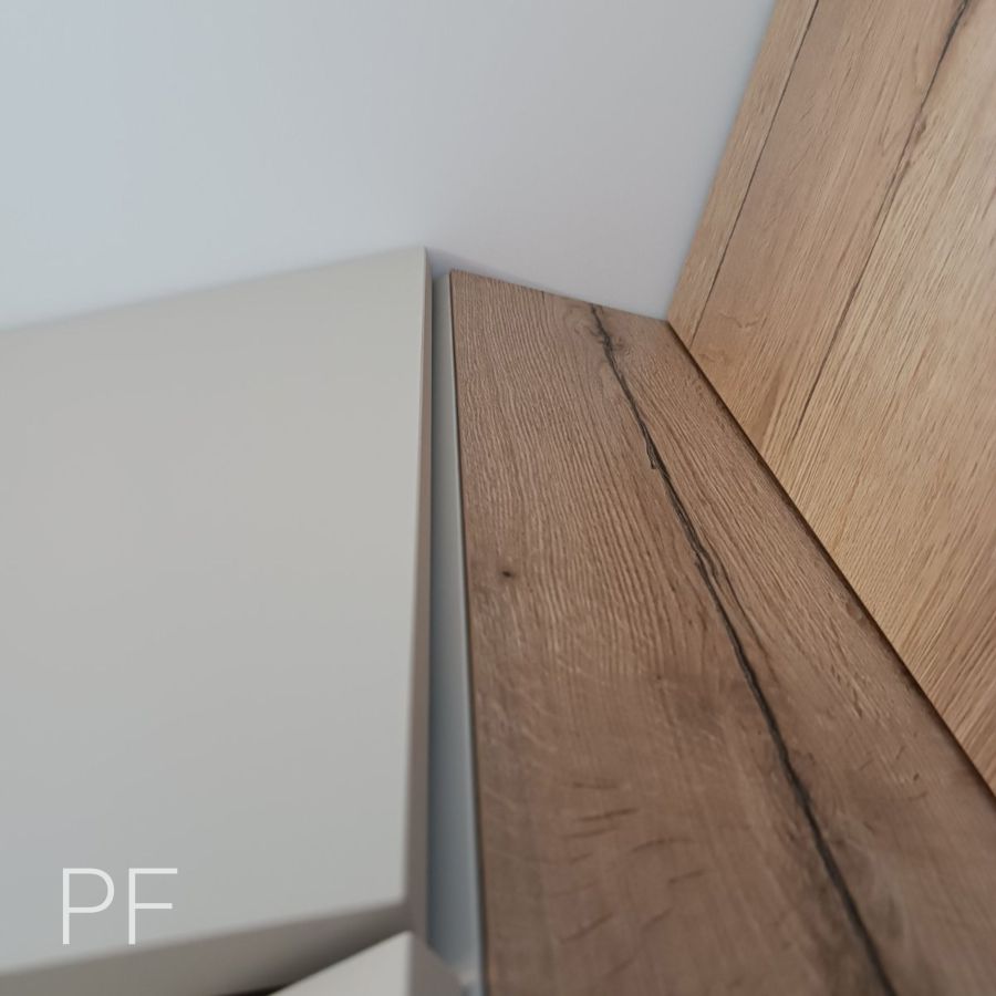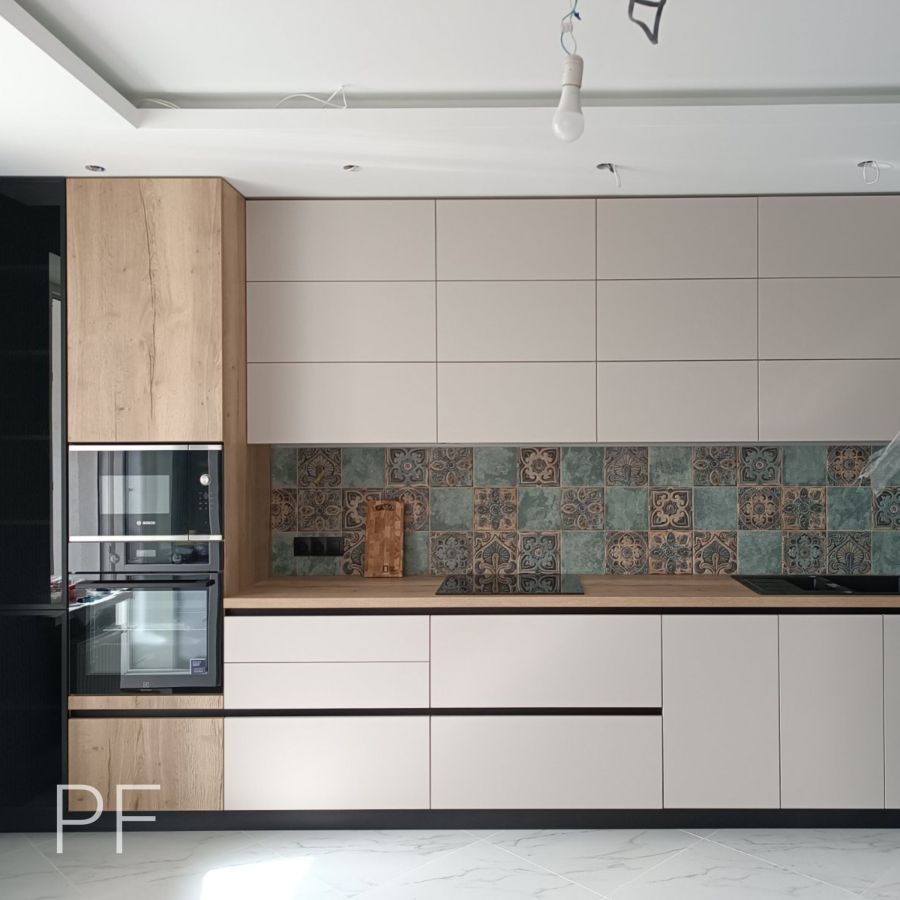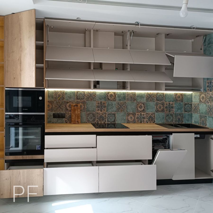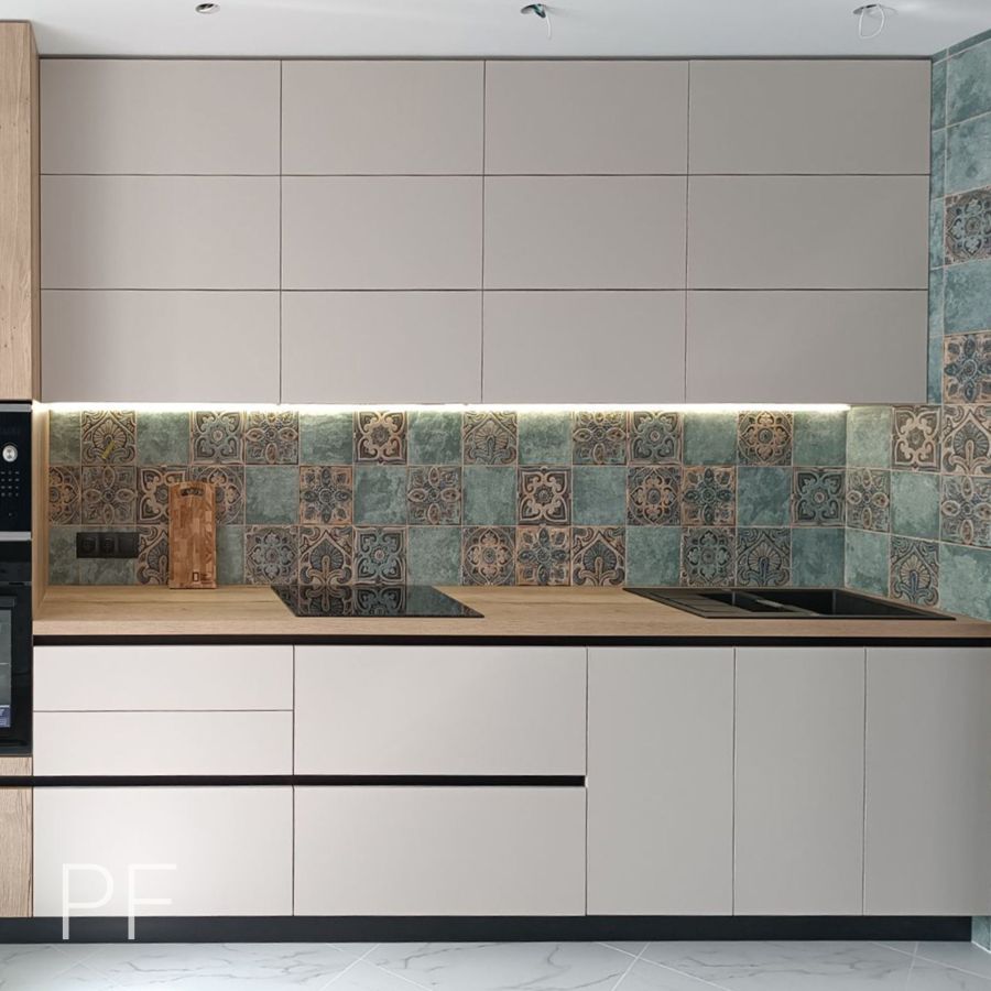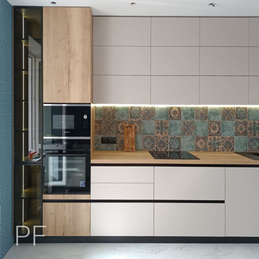 Акриловые фасады цвета Кашемир идеально сочетаются со столешницей Дуб Галифакс Натуральный. Шкаф-витрина с графитовым стеклом в z-профиле и подсветкой делают кухню нарядной и стильной.