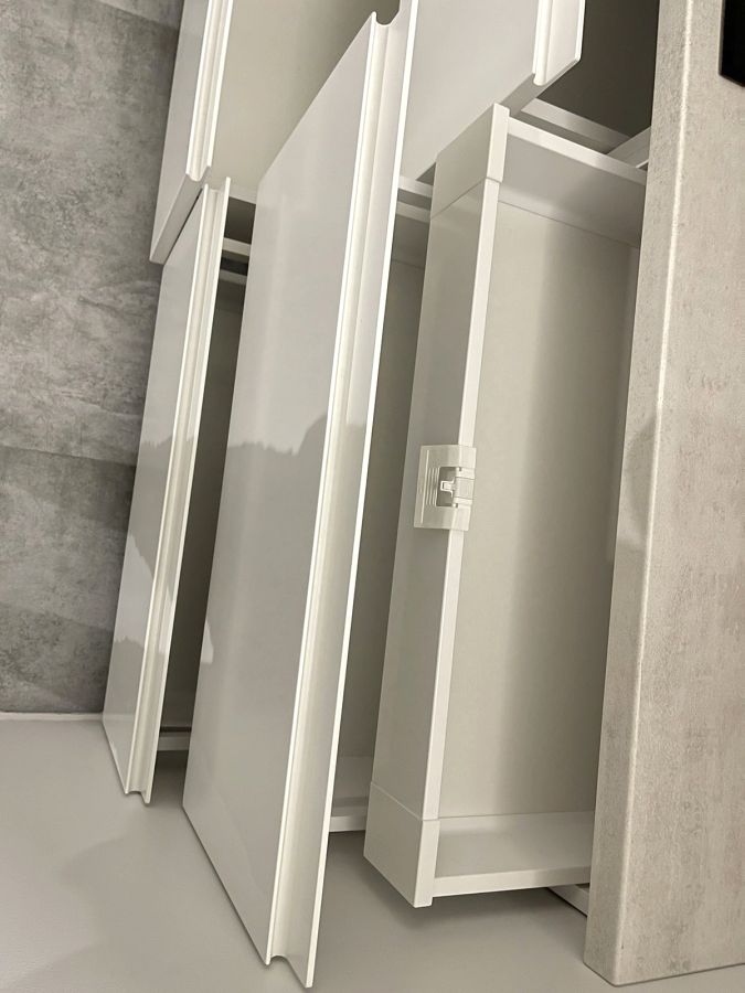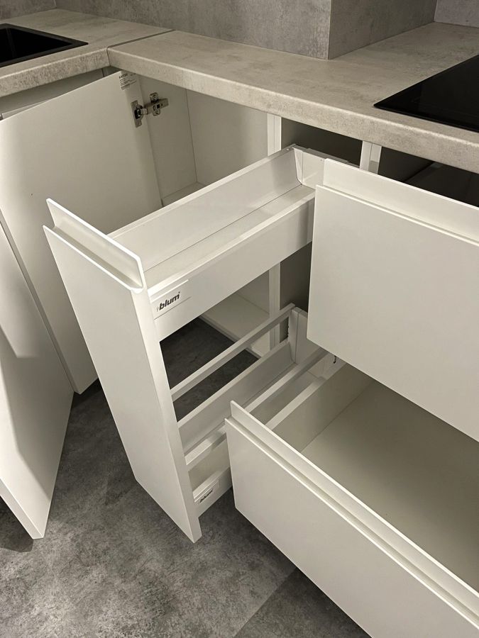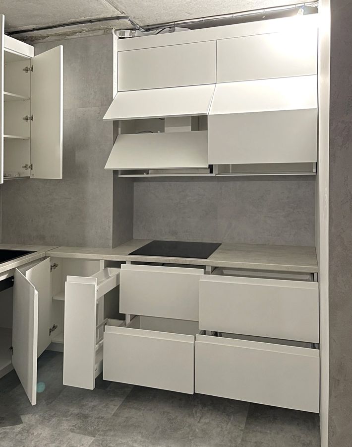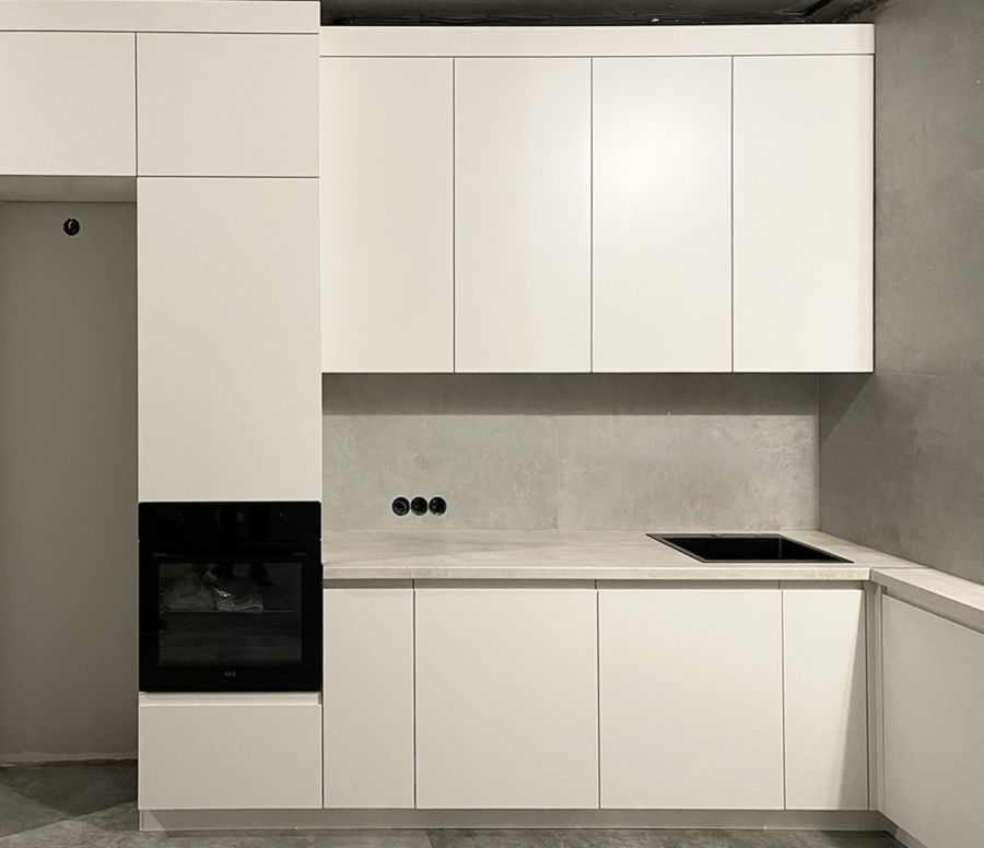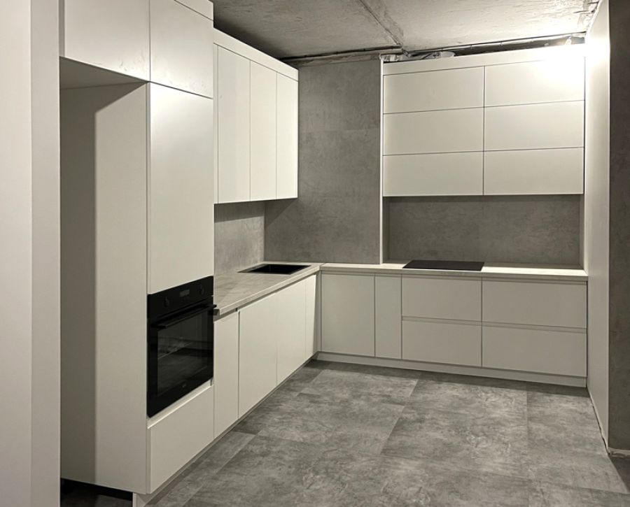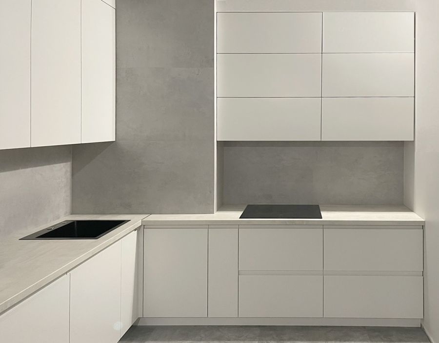 Лаконичная кухня в стиле минимализм, выполненная в спокойных белых оттенках. Гладкие фасады без ручек подчёркивают чистоту линий и создают ощущение простора. Угловая компоновка обеспечивает удобное рабочее пространство и максимальное использование каждого метра. Высокие шкафы дают дополнительное место для хранения, а нейтральная цветовая гамма легко сочетается с любыми элементами интерьера — от бетона и камня до дерева.