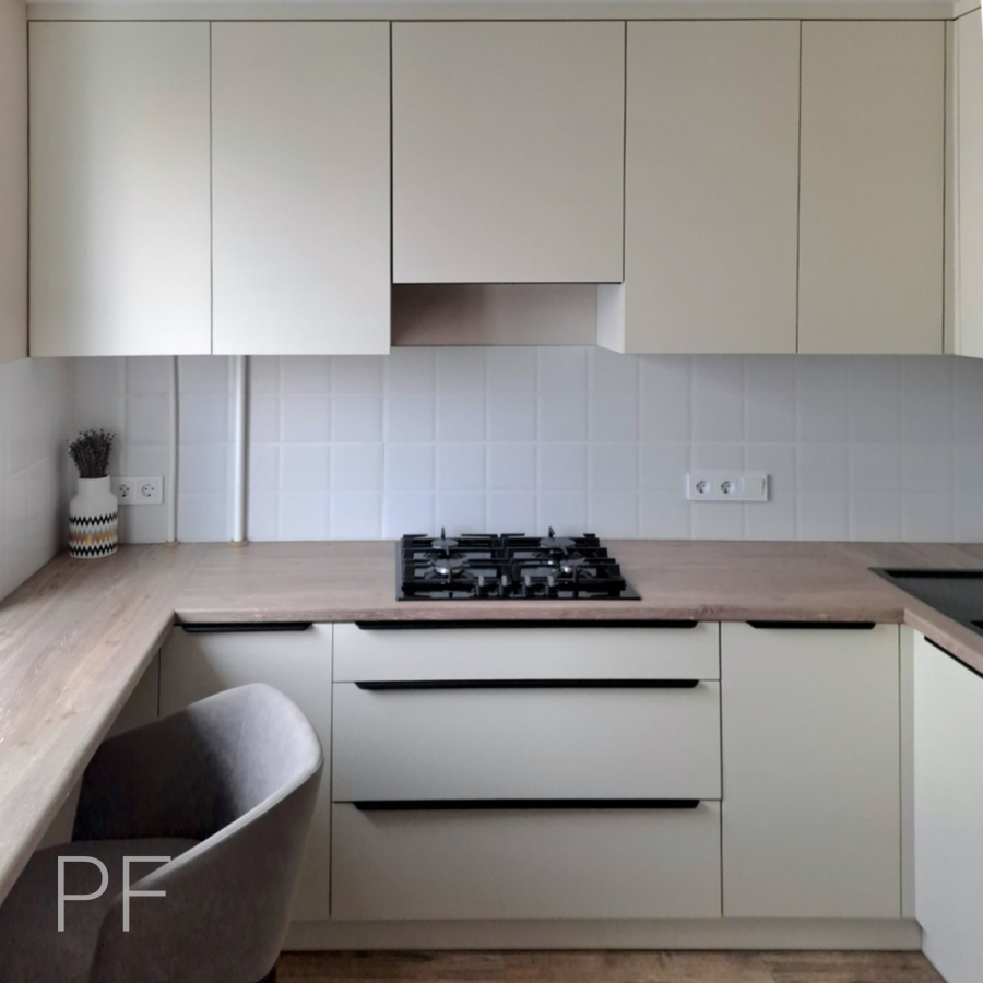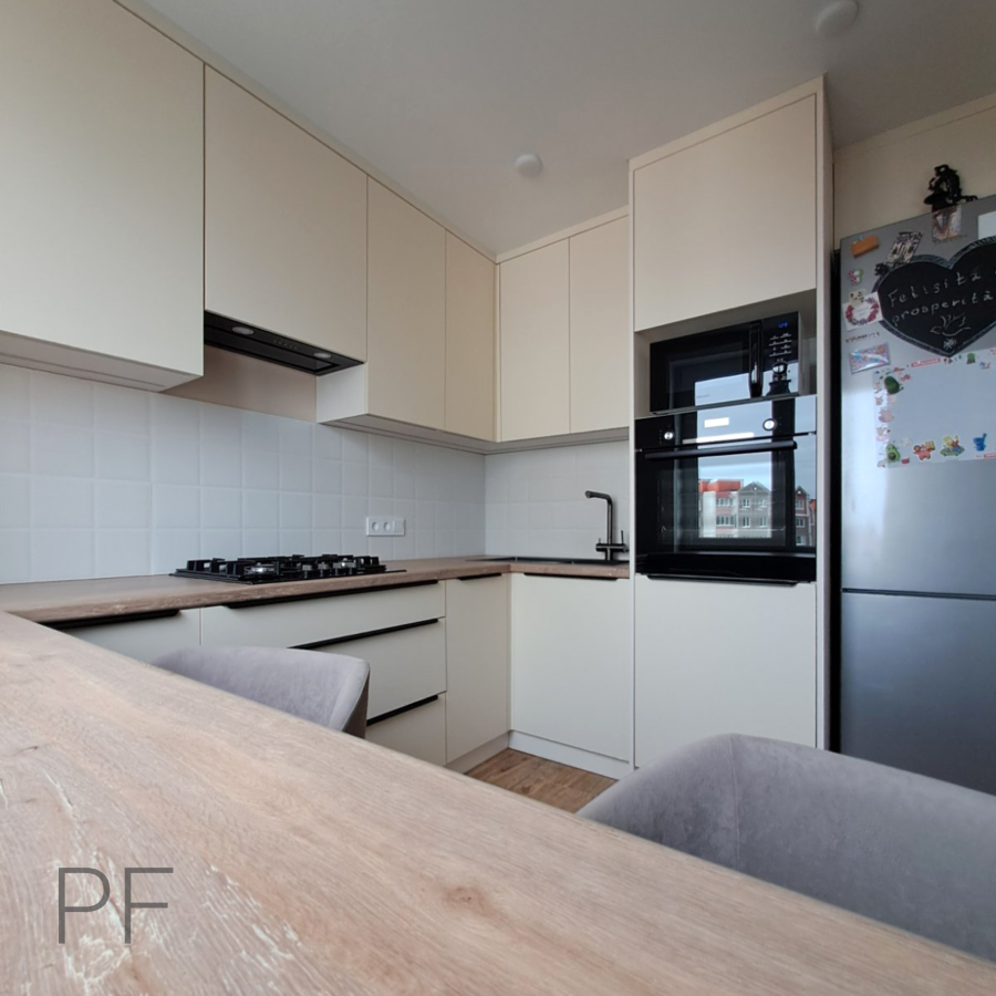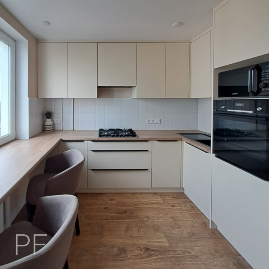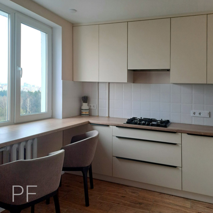 В этой кухне было решено отказаться от стола в пользу подоконника-столешницы. Благодаря этому решению помещение выглядит легким и неперегруженным. Кухня объединена с гостиной.