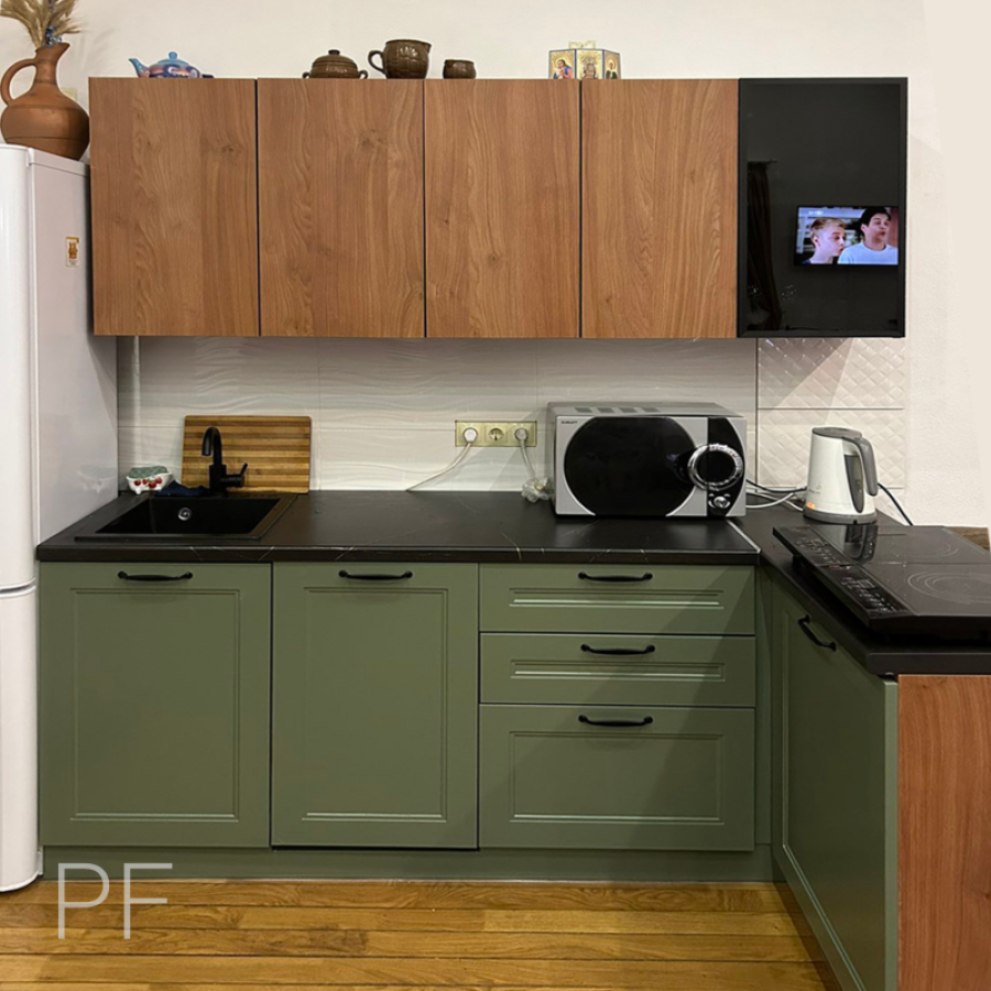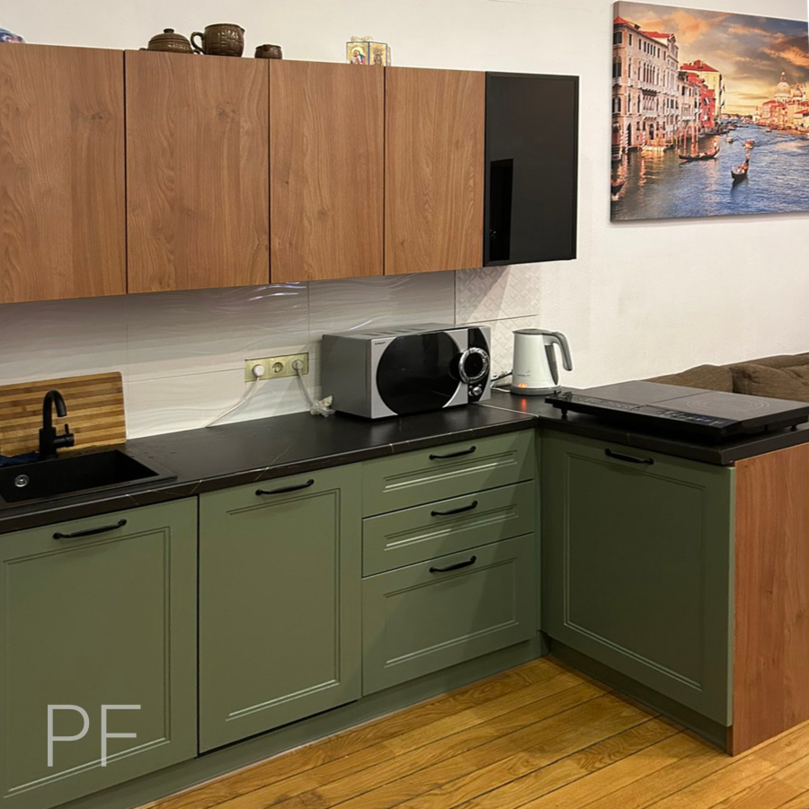 Pan Fasad ТМ (Беларусь) низ - МДФ тип фасада 4.4, матовая покраска, цвет TIKKURILA S448 верх - лДСП EGGER (Австрия), цвет Дуб Кендал Коньяк H3398 ST12 витрина - профиль Z1. цвет Черный браш, наполнение - стекло, цвет Dark-Grey |