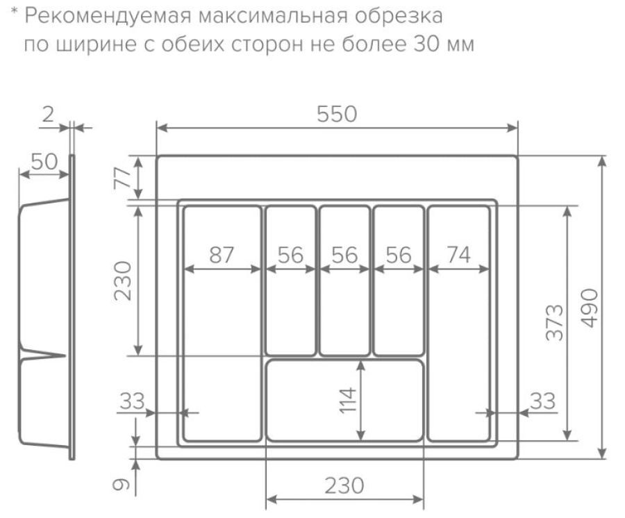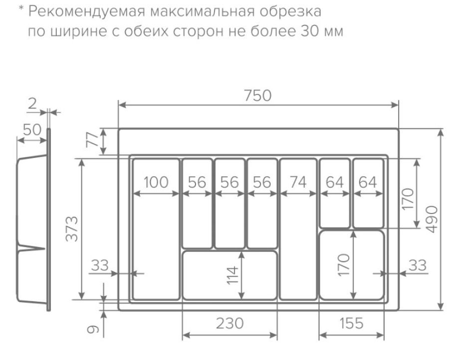 - Универсальность лотка по глубине 450-500 мм за счет возможности подрезки AQ TRAY по дальнему краю. На обратной стороне лотка есть насечки для идеального реза.