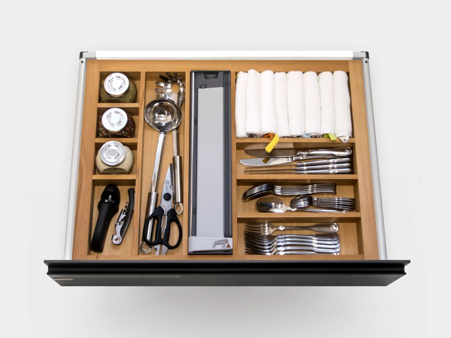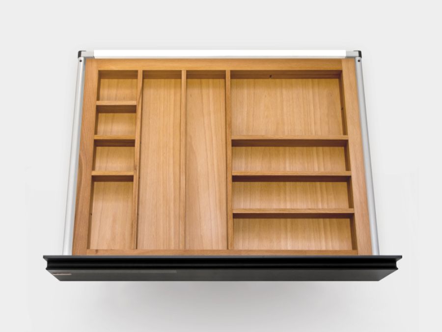 - Лотки для столовых приборов и кухонных принадлежностей из массива бука разработаны по принципу модульных делителей