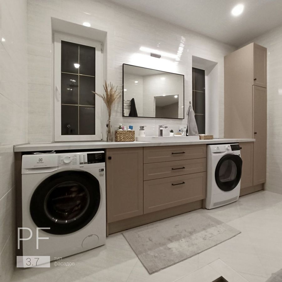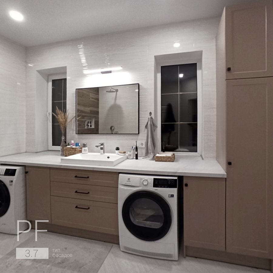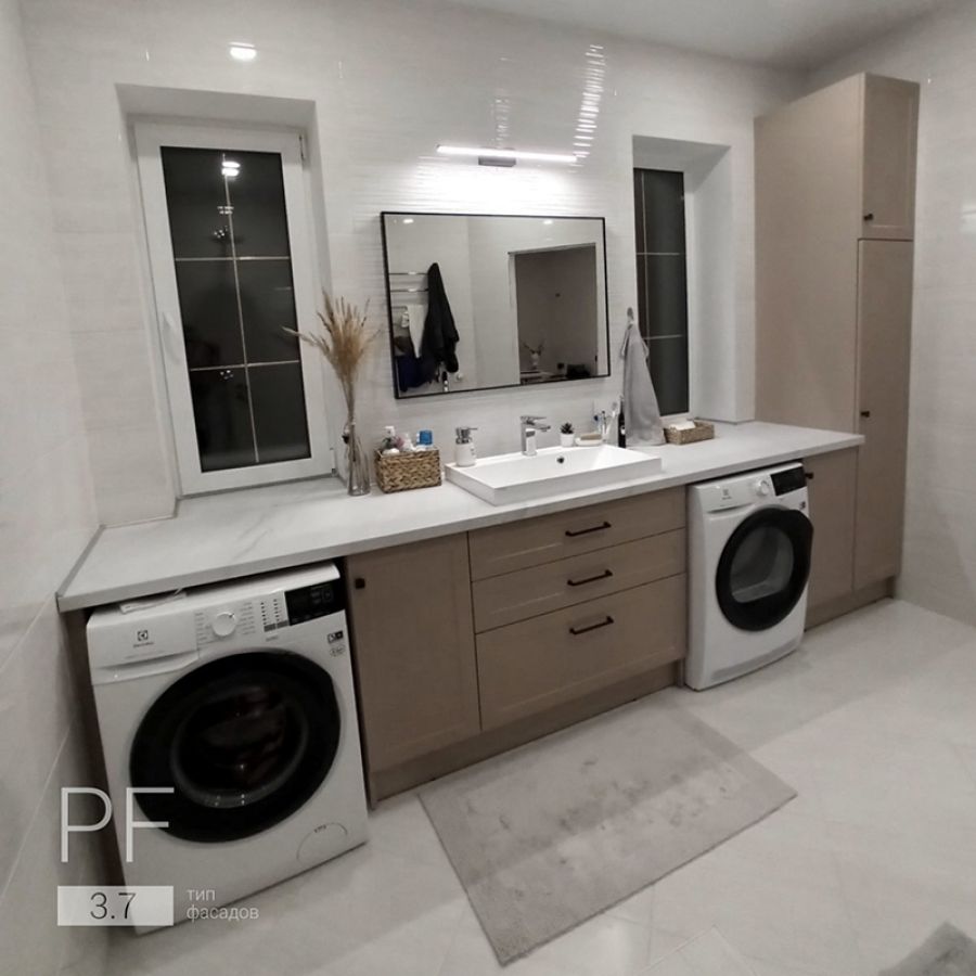Вместительный комплект мебели для просторной ванной комнаты. Большая светлая столешница. Теплого, мягкого цвета фасады. Приятное сочетание для комфорта наших заказчиков.