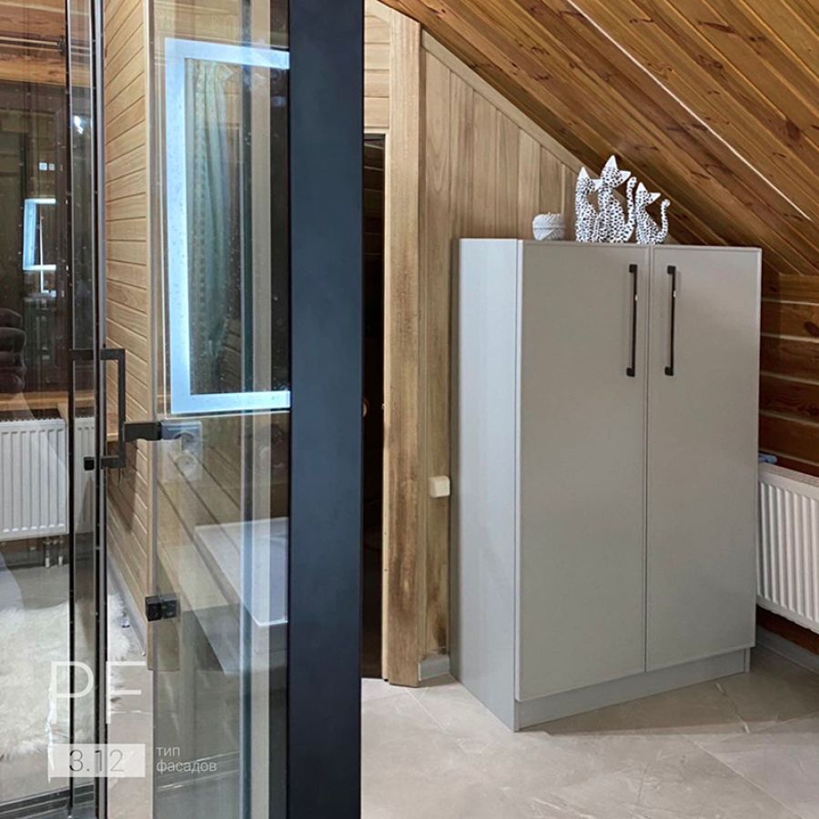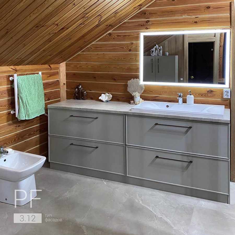 Напольный шкаф-пенал и вместительная тумба под накладной умывальник - отличное решение для просторного санузла. Мы выбрали сложный приглушенный цвет фасадов, лаконичную узкую фрезеровку, тонкие удобные ручки из коллекции Стильный модерн, столешницу под бетон и фурнитуру Blum, которая гарантирует высокое качество использования на весь срок эксплуатации мебели. Все материалы можно использовать в помещениях с повышенной влажностью.