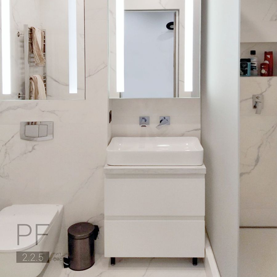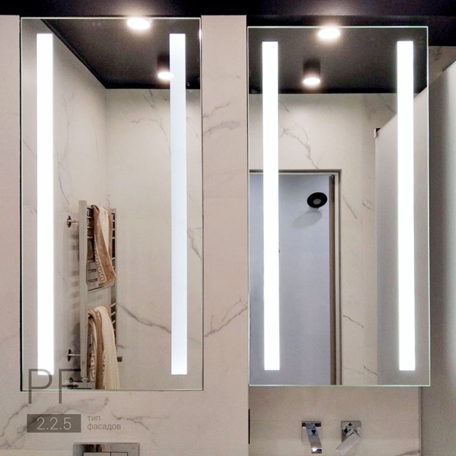 Навесные зеркальные шкафы с подсветкой и компактная тумба под умывальник для ванной комнаты. Удобно, практично и красиво. Всё изготовлено под заказ в Pan Fasad. Все материалы можно выбрать в наших салонах.