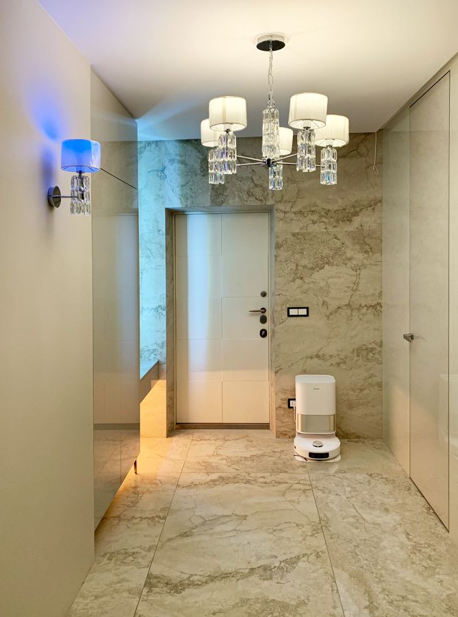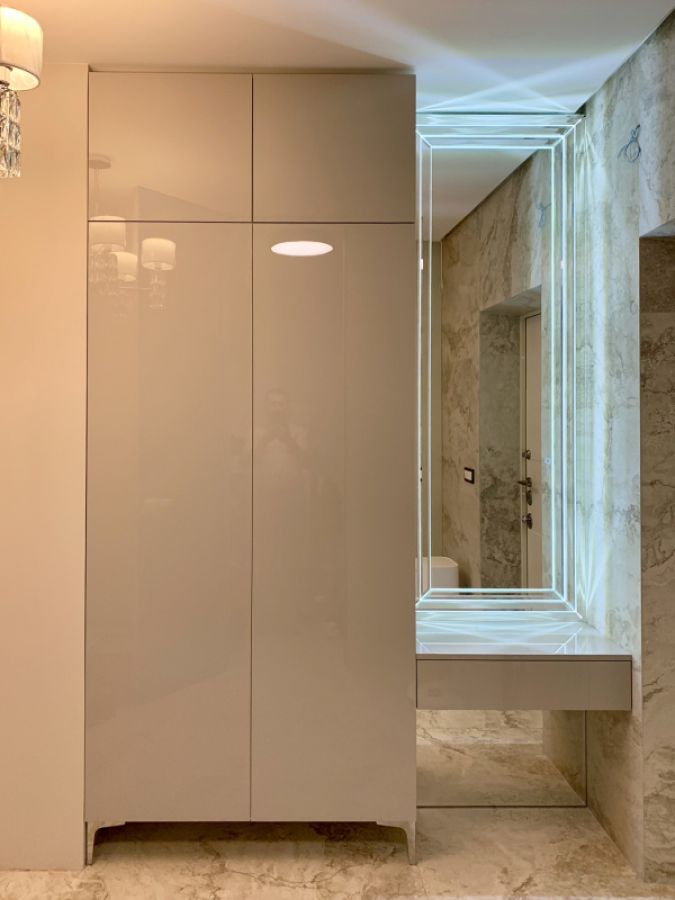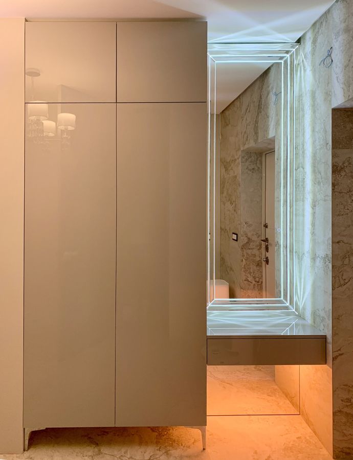 Современное решение для стильной прихожей или спальни. Шкаф выполнен с гладкими глянцевыми фасадами, которые визуально расширяют пространство и создают ощущение легкости. Встроенный туалетный столик дополнен дизайнерским зеркалом с LED-подсветкой, обеспечивающей комфортный свет для макияжа и ухода.