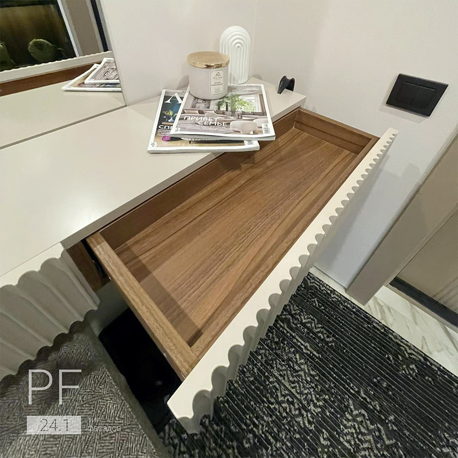 В навесной полке две шуфляды с системой полного выдвижения Tandem Blum. Открытие от нажатия tip-on. Фасады изготовлены из МДФ, выбрана нарядная и изящная модель 24.1. Боковины и крышка также выкрашены в цвет фасадов по палитре Tikkurila. Внутренняя часть изготовлена из ДСП в древесном декоре.