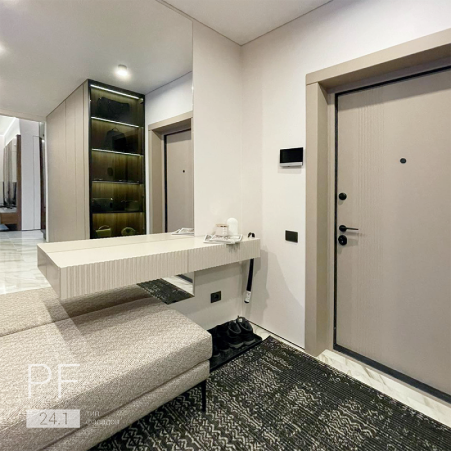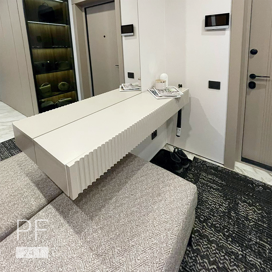 Тумба для прихожей. Она нужна для хранения мелких вещей, ключей, аксессуаров, под ней разместилась зона для обуви, рядом банкетка-пуф. Все смотрится гармонично. Зеркало на стене расширяет пространство и создает эффект вау.